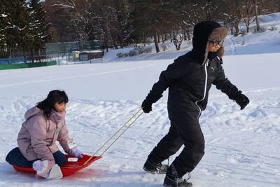 ソリリレーをしたり、ちょっとした坂をソリで滑りました。